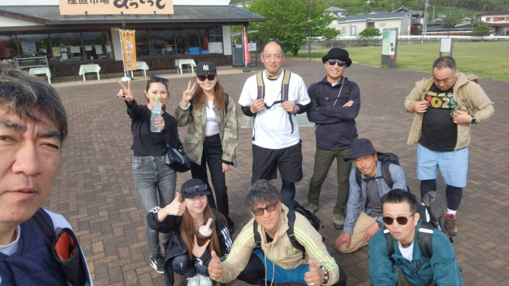 「さぁ、出発の記念撮影しようか。」と言うと、「あ、私とりますよ。」と女性が言うので、「いいから、いいから、入って。僕が自撮りで撮るから。」と女性3名を中に入れた。