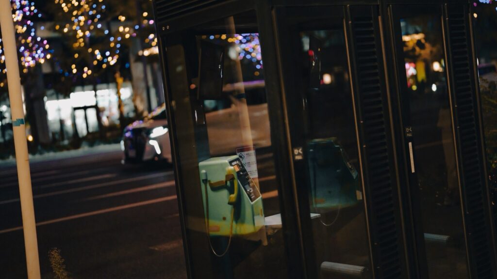 電話ボックスのガラス反射と、背後の光の散らばり。