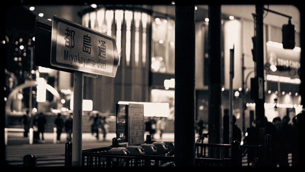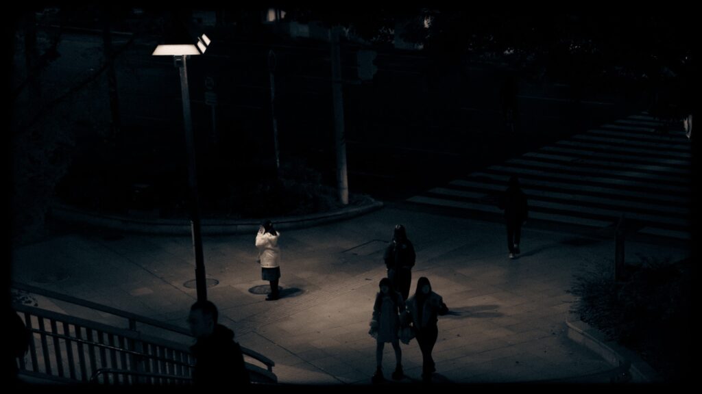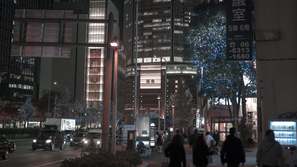 街の大きな光のまとまりと、人の流れが一枚に詰まって全体にピントを合わせた。