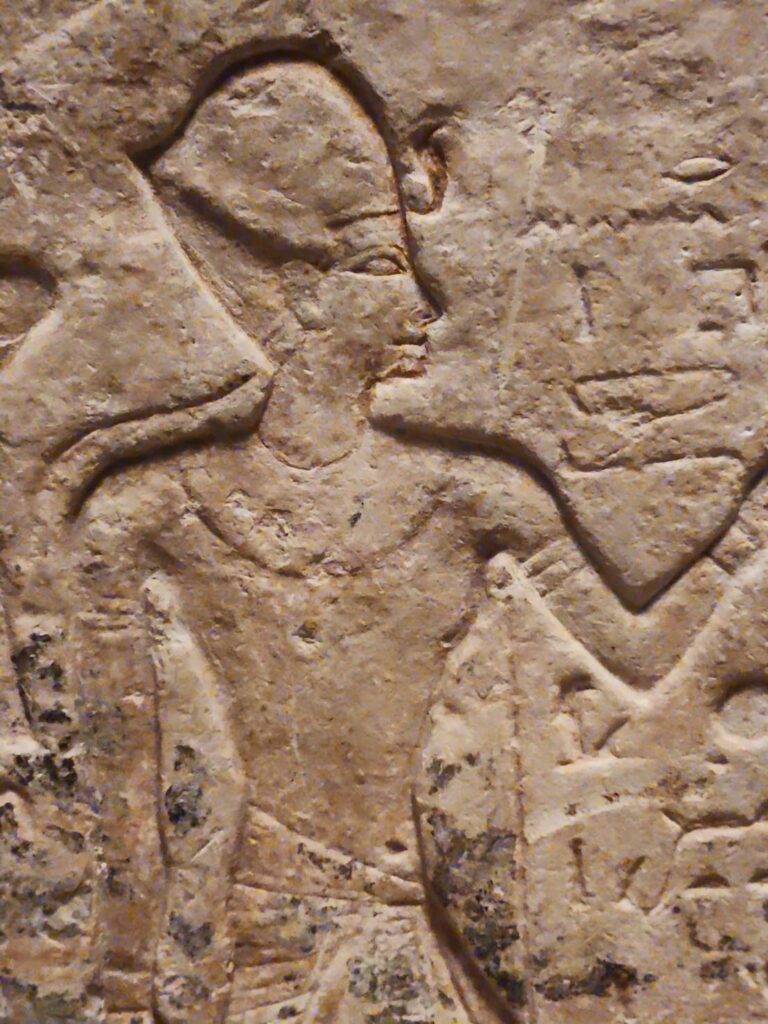 身体は正面を向いているが、顔は横顔という特徴的なシルエットが終始一貫した、エジプト芸術だ。よく見ると、目元、鼻先、が細かく表現してあって、象形文字?だろうかが刻まれていた。