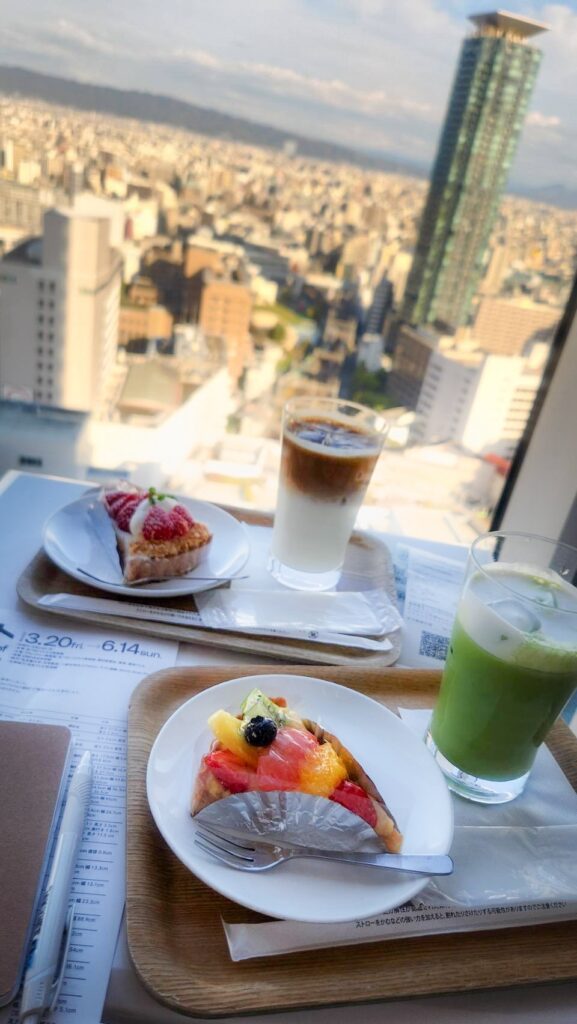 あべのハルカスの美術館を出て、エスカレーターを上がったところに、眺めの良いスタバ風の店があり、息子はフルーツタルトとカフェオレを、僕はいちごタルトと抹茶オレを注文した。