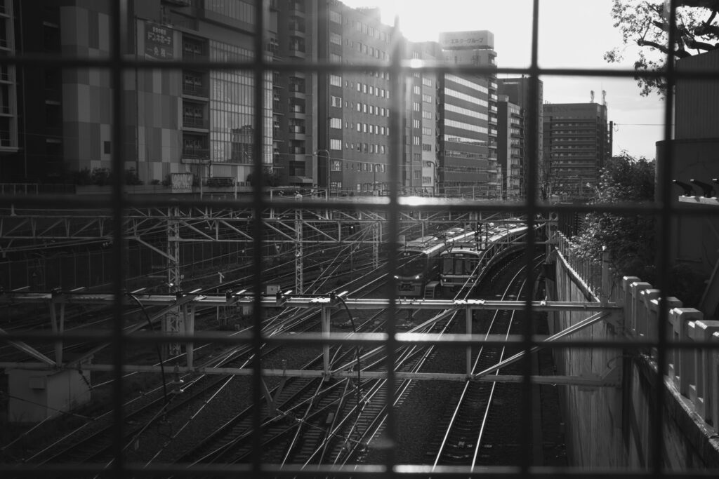 橋に金網が張られていて、電車があり、線路があり、電柱があり、ビルあり、いろんなものにピントを当てたくなったので、F値を上げたら、ピントのあったそれらは、みるみるうちに重なって、フレームの中に収まった。