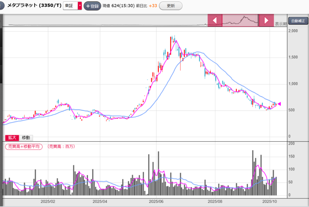 日足チャートを見る限り、500円は底値添えとして意識されている。高値1900円からの下落、そして再びの反発。出来高も増えてきている。