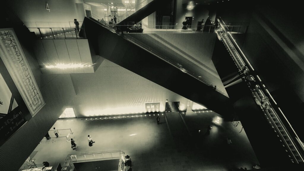 だから少し意識の向きを変えて、美術館と鑑賞する人々と作品で立体的に感じる事にした。そしてこの構図が美しいなと思って自分の作品を生み出す事にした。そしてキリトリ撮影したら、警備員に注意された。