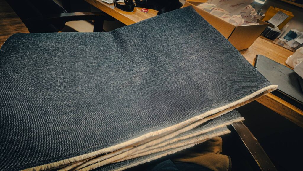 2日ほど難波を歩き回って生地を探していたんだそうだ。ジーンズ生地というものがあるにはあるんだけど、どれもお目当てのモノじゃなかったと。